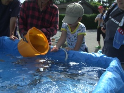 | 一時水槽に移して、放流先に移動し放流します。 |