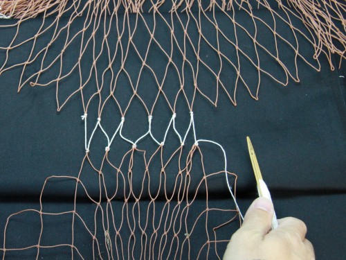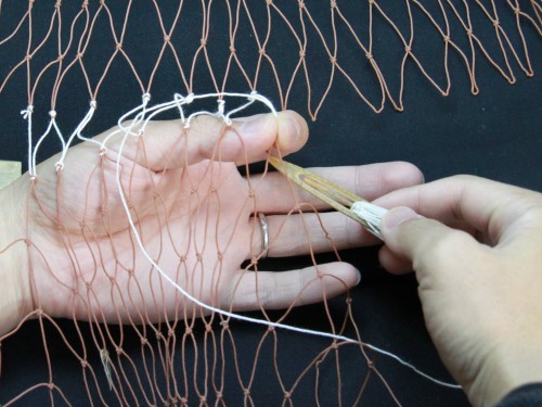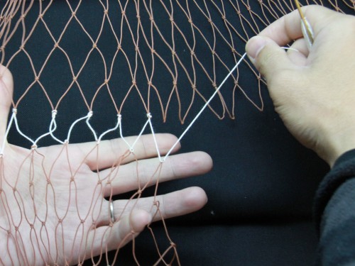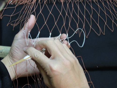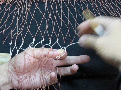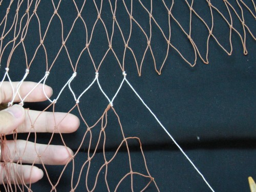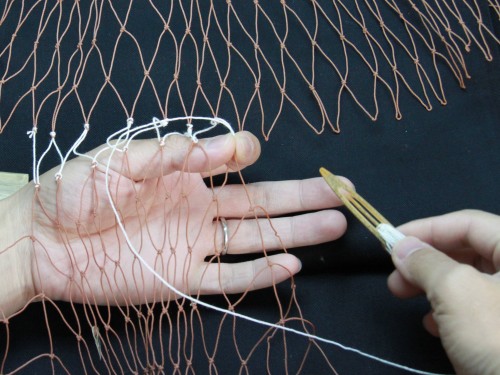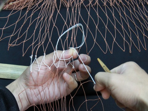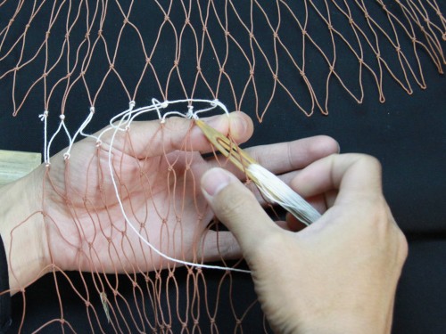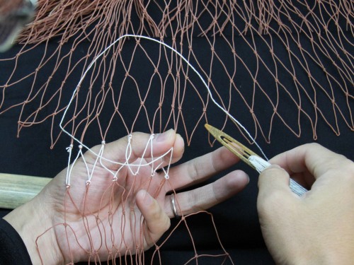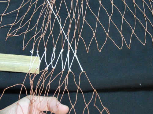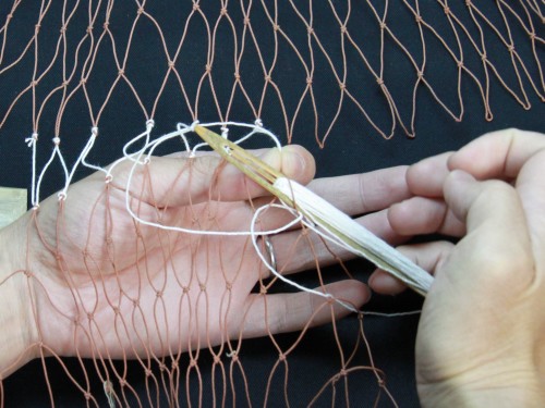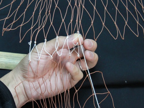 | 23 糸を締め付けたら完成。このように網は左から右にかけて編んで行きます。V字V字と編む。 もう少し説明を加えた方が良いと思いますが、今日はここらあたりで終わりにしておきます。 |
