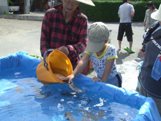 水田の中干しにより、水路の水がなくなりますので、水路にいる魚を捕獲し加勢川に放流しました。