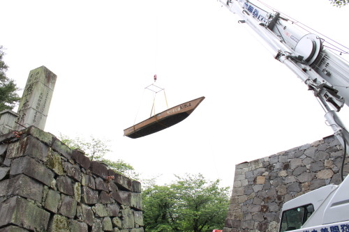 | 1 加勢川から和船4隻を運び、 25tクレーンで吊っておろしました。 (スケジュール) 4/30 大型土のうで河川を締め切り、水位を上昇させる。 5/1 船着き場の設置。 5/2 船移動。 5/3〜6 川下り!! |
